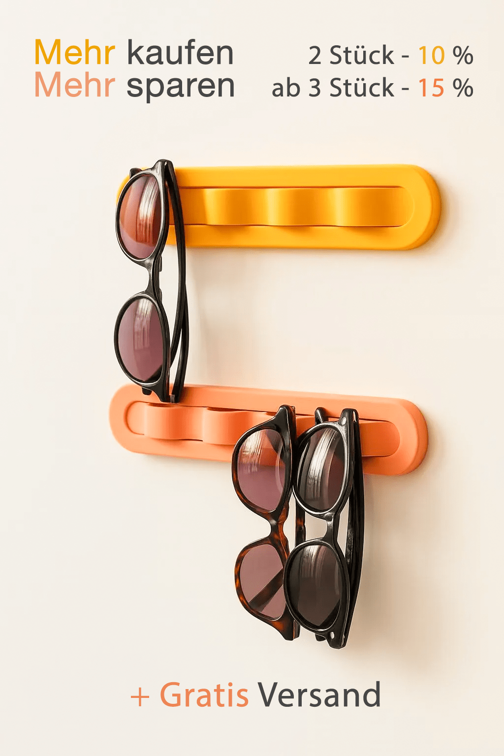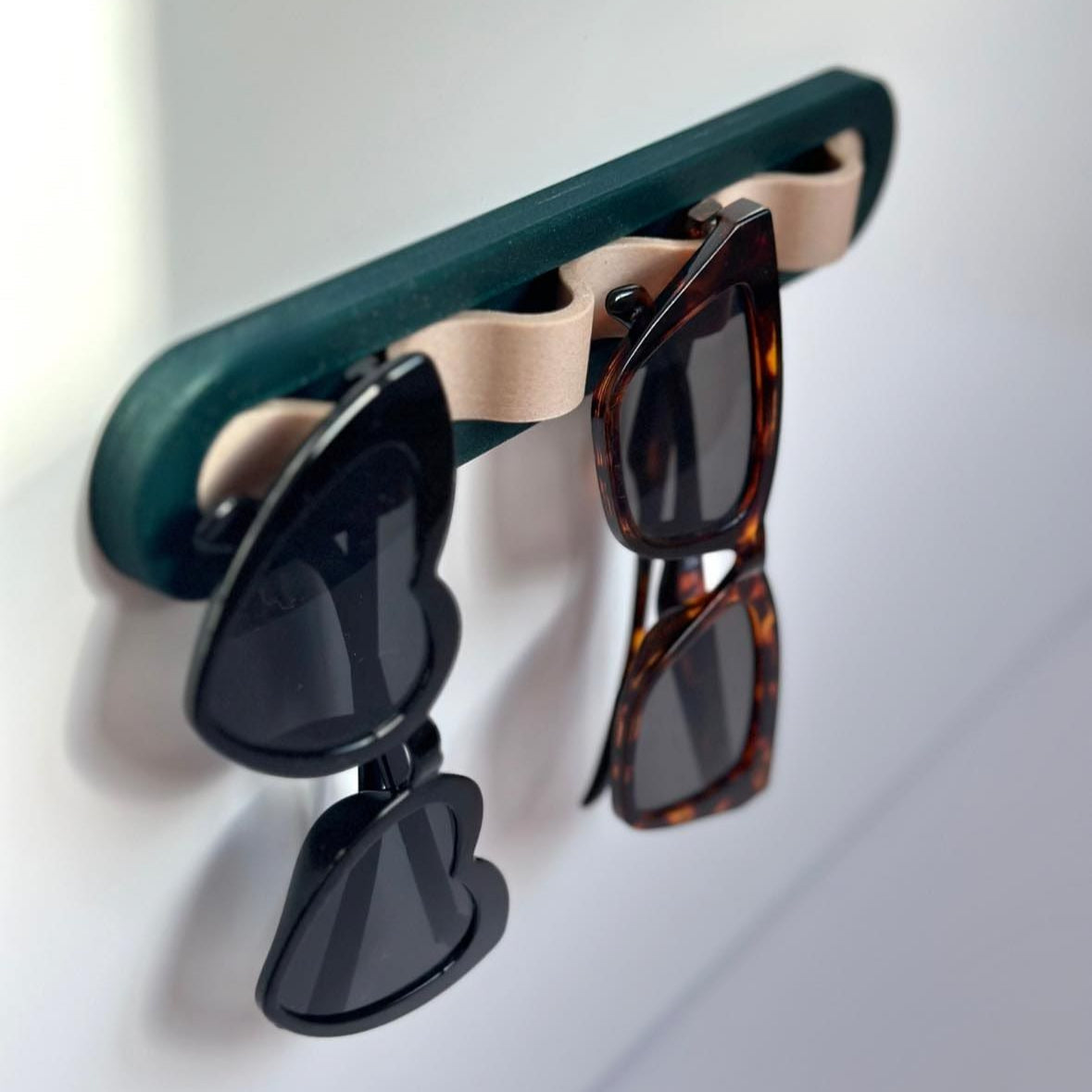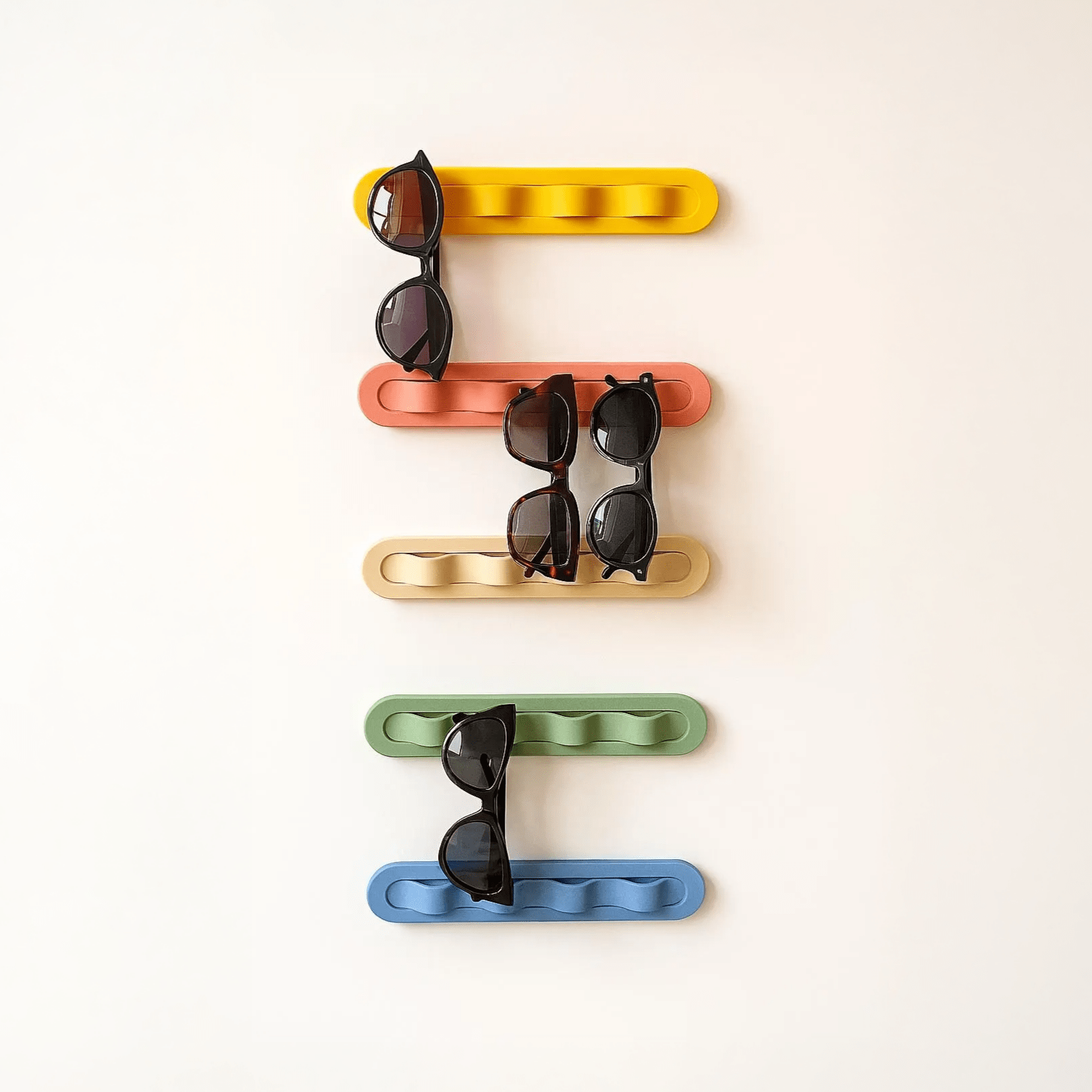Say goodbye to clutter and missing shades. SOLWAVE is the sleek, no-drill wall-mounted holder that keeps up to 4 pairs of glasses in one place.